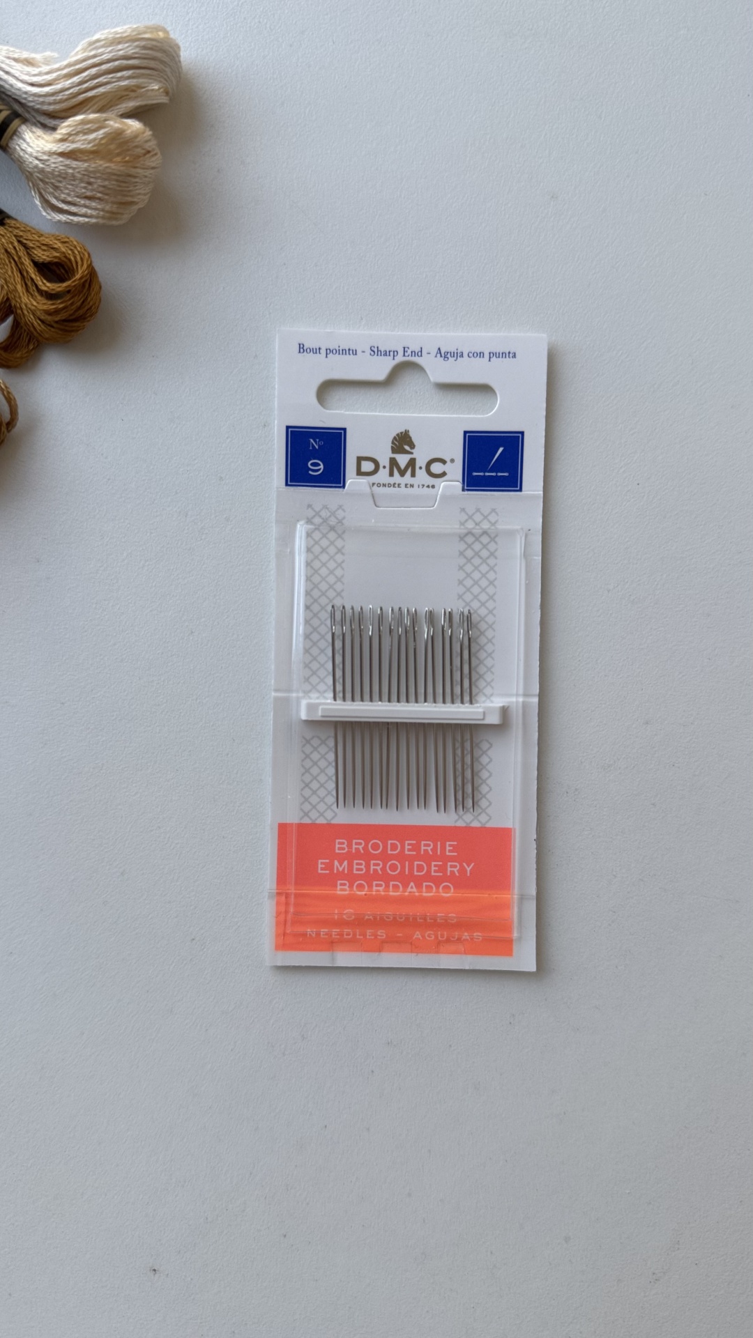 As agulhas de Bordado 9 contém 16 agulhas de bordado tamanho 9 (para utilizar com Diamant, Mouliné Spécial de 1-4 cabos ou Algodão Perlé 5-8).