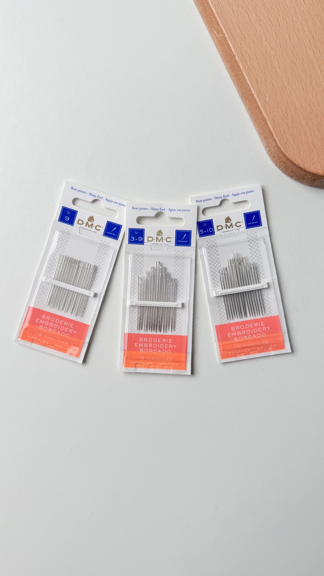 As agulhas de bordado DMC estão disponíveis nos tamanhos 1 a 10, quanto menor o número maior a agulha, pelo que a agulha de bordado tamanho 10 é a mais fina. As agulhas tamanhos 7,5 e 3 são também conhecidas como agulhas crewel, que derivam o seu nome dum estilo tradicional de bordado que utiliza um fino fio de lã de 2 cabos.