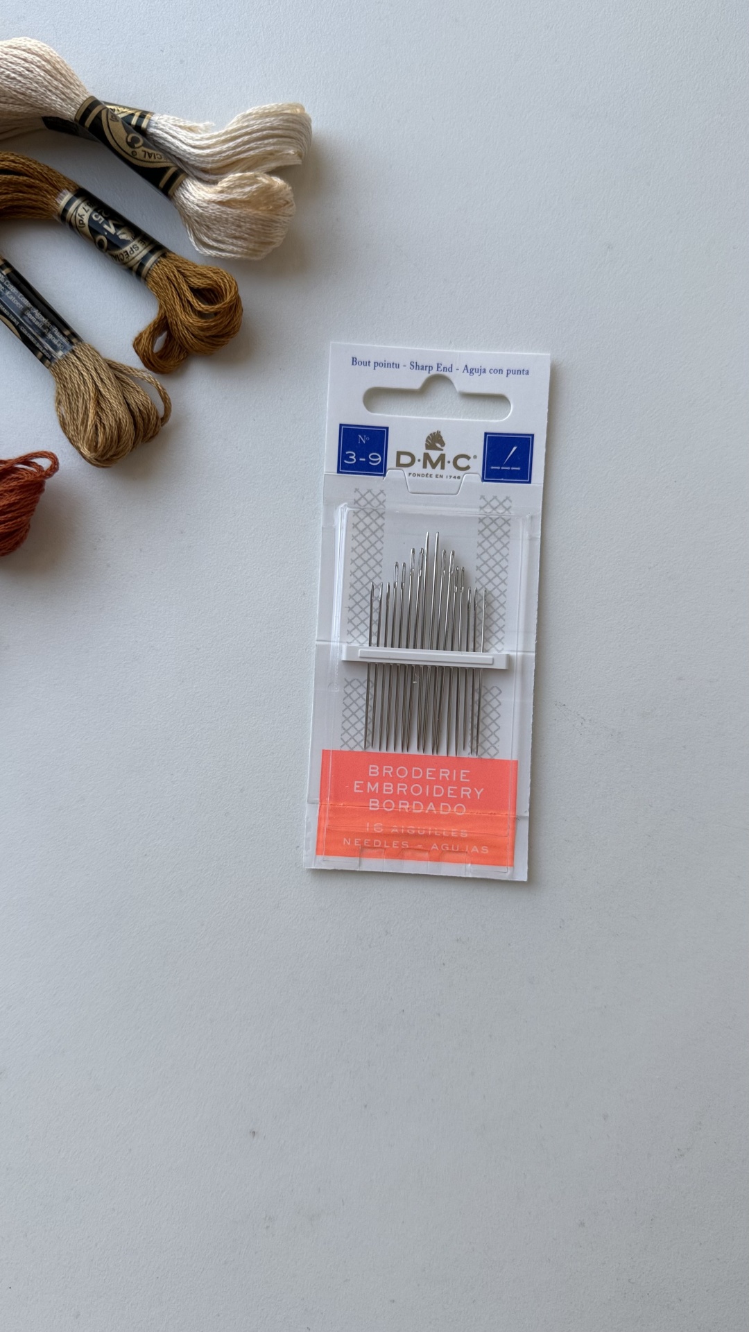 As agulhas de Bordado 3/9 contém 16 agulhas de bordado (para utilizar com Diamant, Mouliné Spécial de 1-4 cabos ou Algodão Perlé 5-8):
