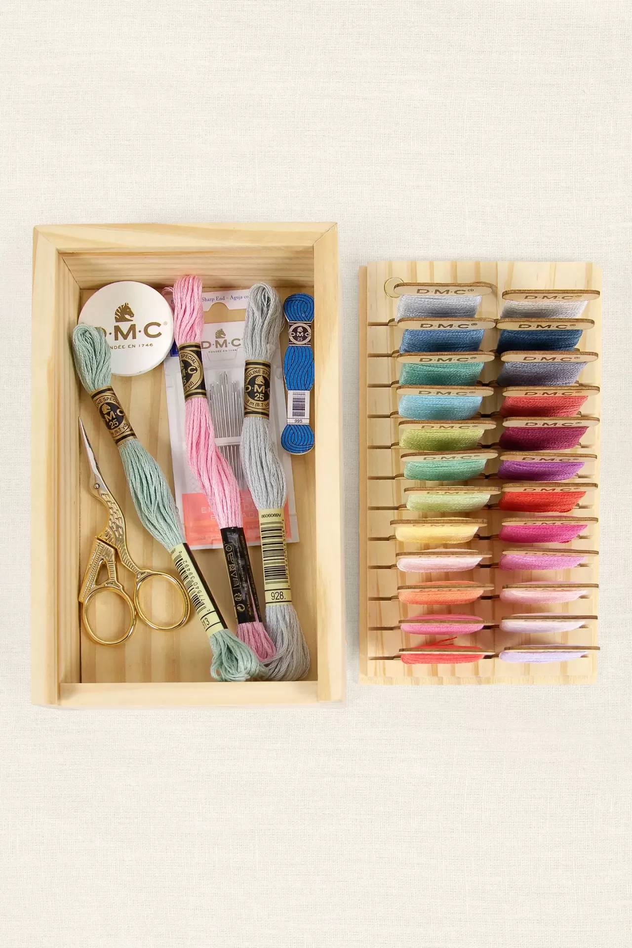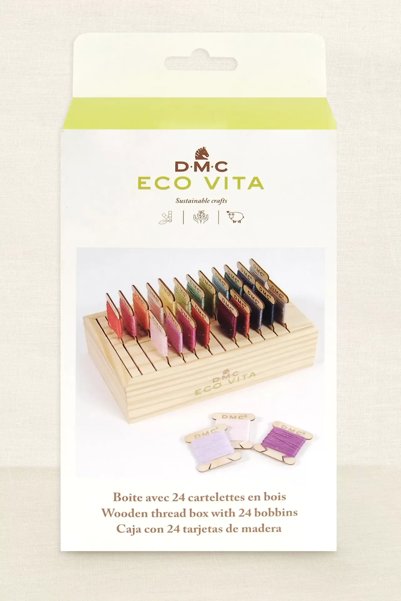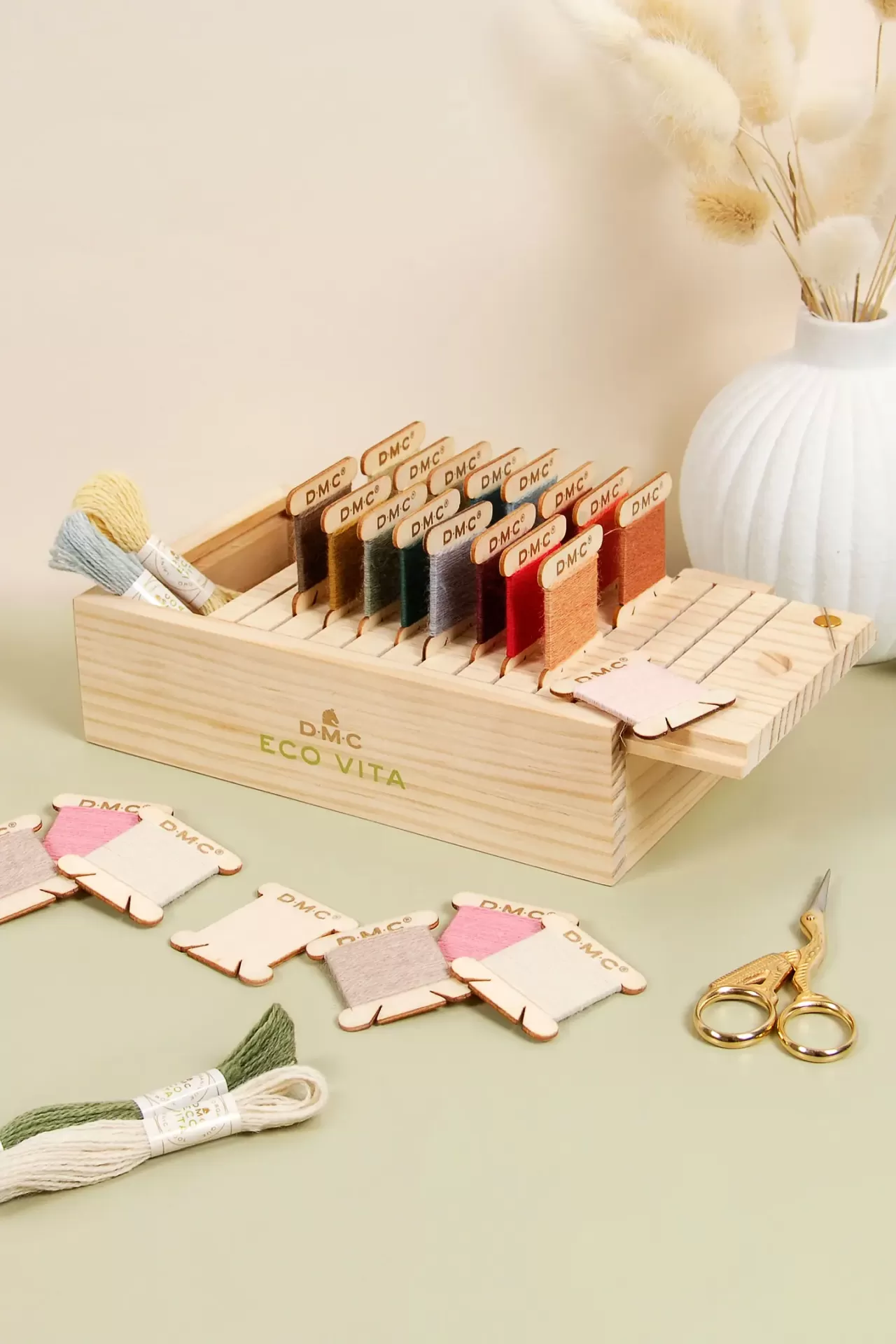 Organiza as tuas meadas e material de bordado com elegância e consciência ecológica. A caixa DMC Eco Vita é feito em madeira natural de Pino e inclui placas reutilizáveis para enrolar as linhas, permitindo manter tudo em ordem de forma prática e sustentável.