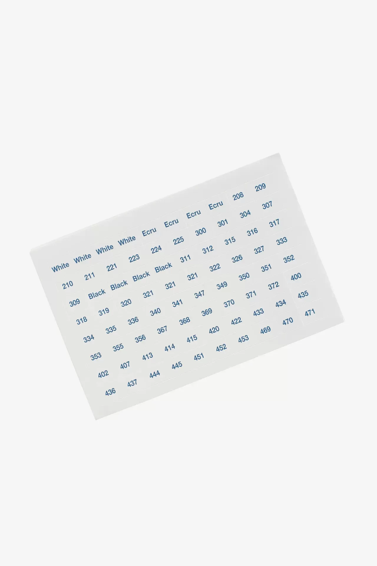 Lote de 640 etiquetas pré-impressas com os números de todos os tons de algodão sólido e variado, mais os extras dos nossos tons mais populares e 20 etiquetas em branco para os seus preferidos.