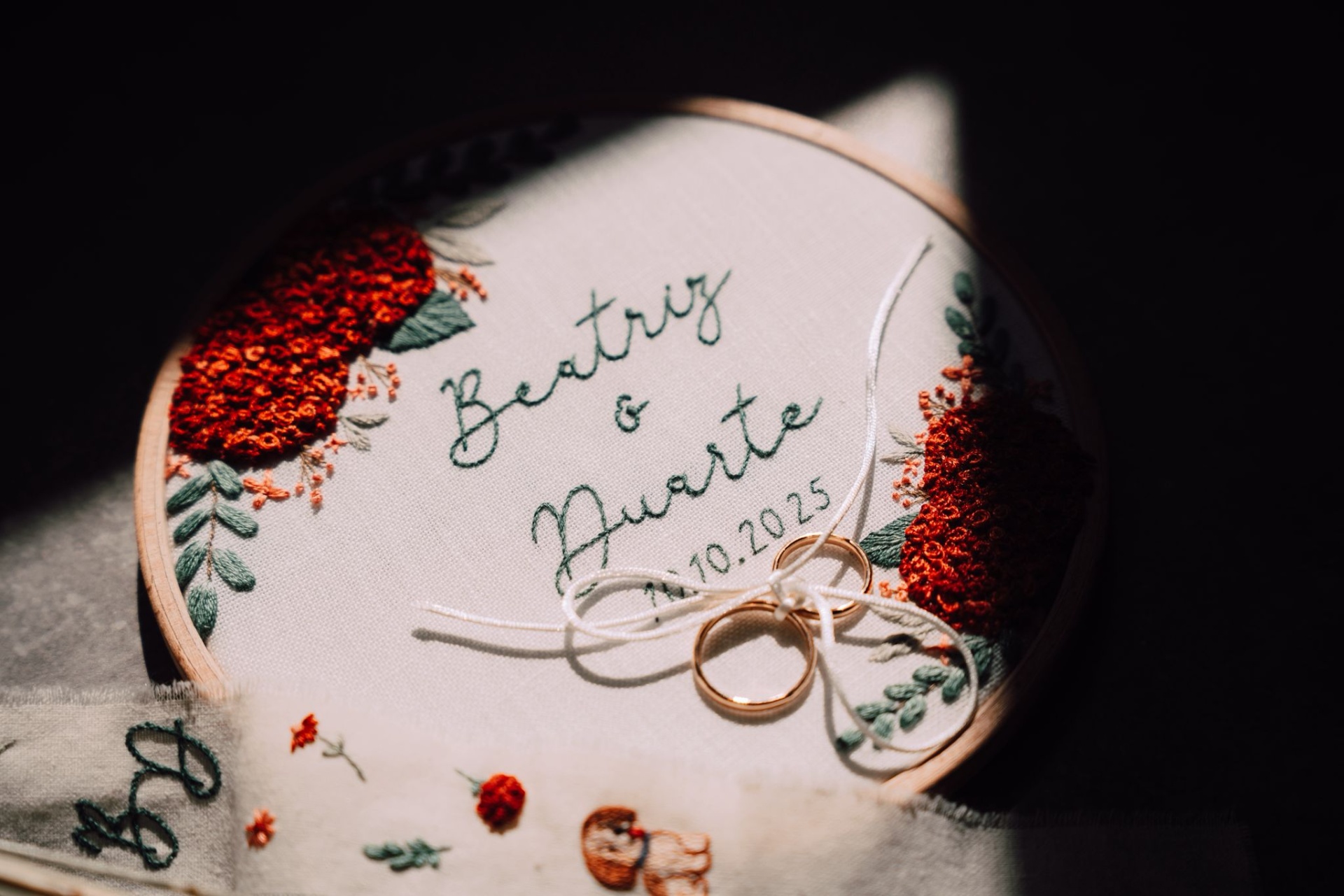 O porta-alianças é muito mais do que um simples acessório no dia do teu casamento; é uma peça simbólica que guarda as tuas memórias do momento tão único que é a troca das alianças.e No Esmeralda Atelier, personalizamos porta-alianças com bordados delicados, que podem incluir as iniciais dos noivos, a data do casamento ou até detalhes florais e elementos que complementam o tema da cerimónia ou a identidade visual do mesmo.